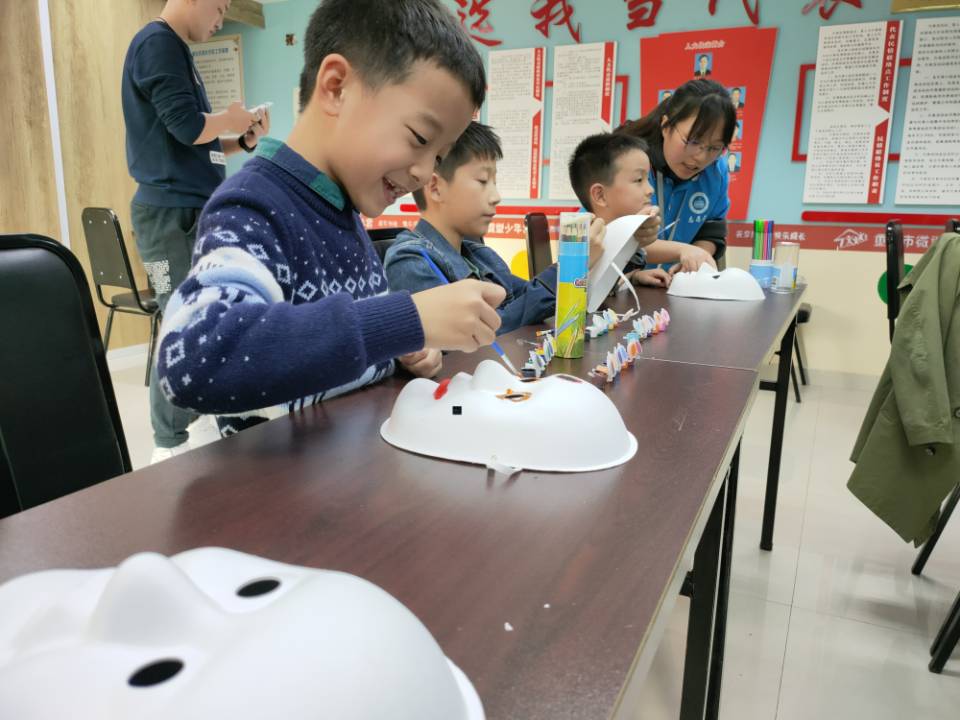 知识普及结束后,即将进入动手操作环节。手工桌上,一张张形状多样的洁白面具,一盒盒五颜六色的染料画笔和种类齐全的绘画工具,静候着每一位小艺术家的到来。活动还未开始,小朋友们就已经跃跃欲试,迫不及待的想要开始绘制脸谱面具啦!拿到画笔的小朋友才思泉涌,画的面具有活灵活现的,有调皮捣蛋的,也有色彩斑斓的。