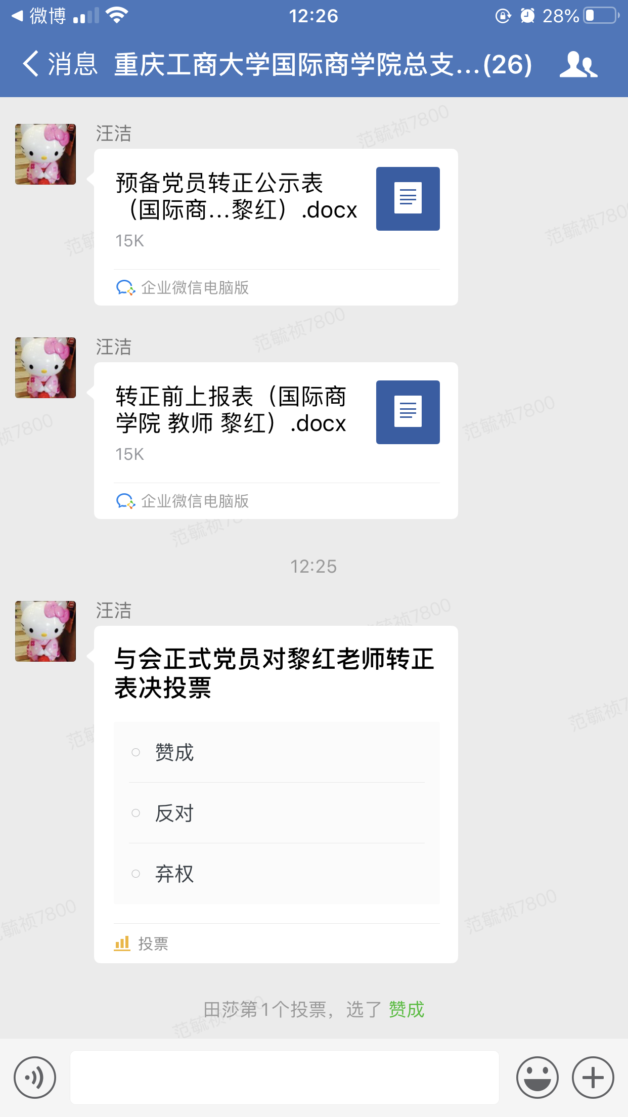 2020年3月26日,中共qmh球盟会亚博总支学生二支部在企业微信群召开了3月份的支部大会,本次会议主要讨论了黎红老师的转正问题并对本学期的主题党日活动进行了安排。学生二支部书记汪洁老师,党支部王娟老师、田莎老师及二支部全体成员参加了本次大会。支部大会应到26人,实到26人。