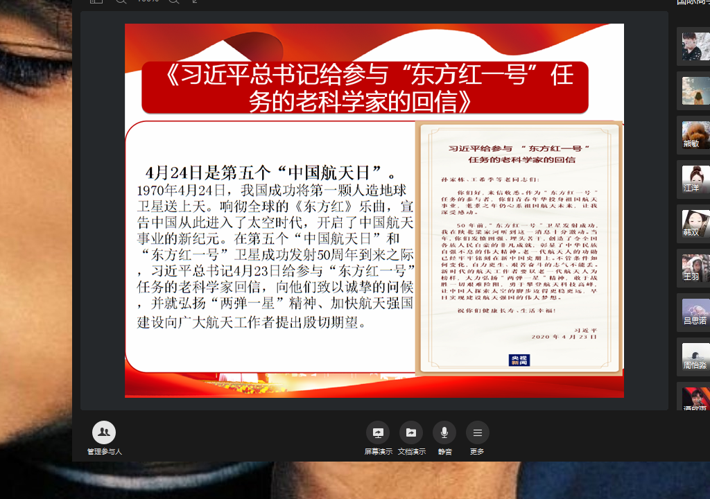 2020年5月19日,球盟会qmh网站qmh球盟会亚博学生第一支部在企业微信中开展五月线上组织生活会,党支部的邹畅同志和唐蕴仪同志带领大家学习习近平总书记在陕西考察重要讲话精神、习近平总书记浙江考察重要讲话精神、《习近平总书记给参与“东方红一号”任务的老科学家的回信》。以及西迁精神、全国两会精神以及学校关于疫情防控的相关要求。西迁精神”是在1956年交通大学由上海迁往西安的过程中,生发出来的一种宝贵的精神财富。1955年4月,国务院作出交通大学内迁西安的重大决定。自1956年首批师生开赴西安,到1959年迁至西安的交通大学主体部分定名为西安交通大学,交大西迁历时四年,迁校总人数达一万五千余人。2005年12月6日,经西安交大党委会议审议批准,交大西迁精神概括为“胸怀大局,无私奉献,弘扬传统,艰苦创业”16个字。