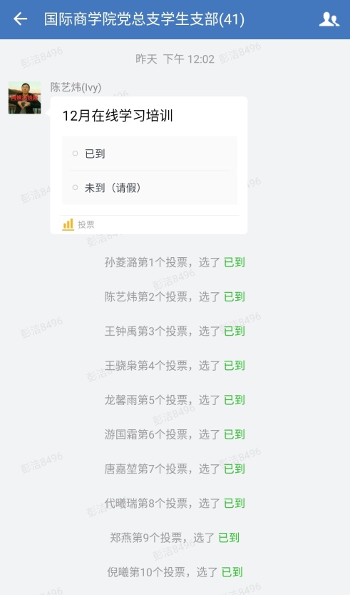 2020年11月19日,中共qmh球盟会亚博党总支学生一、二支部在企业微信群召开了12月份的支部大会,本次会议由一支部王晓枭同学线上介绍习近平总书记关于立德树人的讲话、在科学家座谈会以及基层座谈会讲话的开展了本月的主题党日活动。学生二支部书记汪洁老师,党支部王娟老师、田莎老师、冯诗淇老师、黎红老师、彭丹老师及一、二支部全体成员参加了本次大会。支部大会应到41人,实到40人。