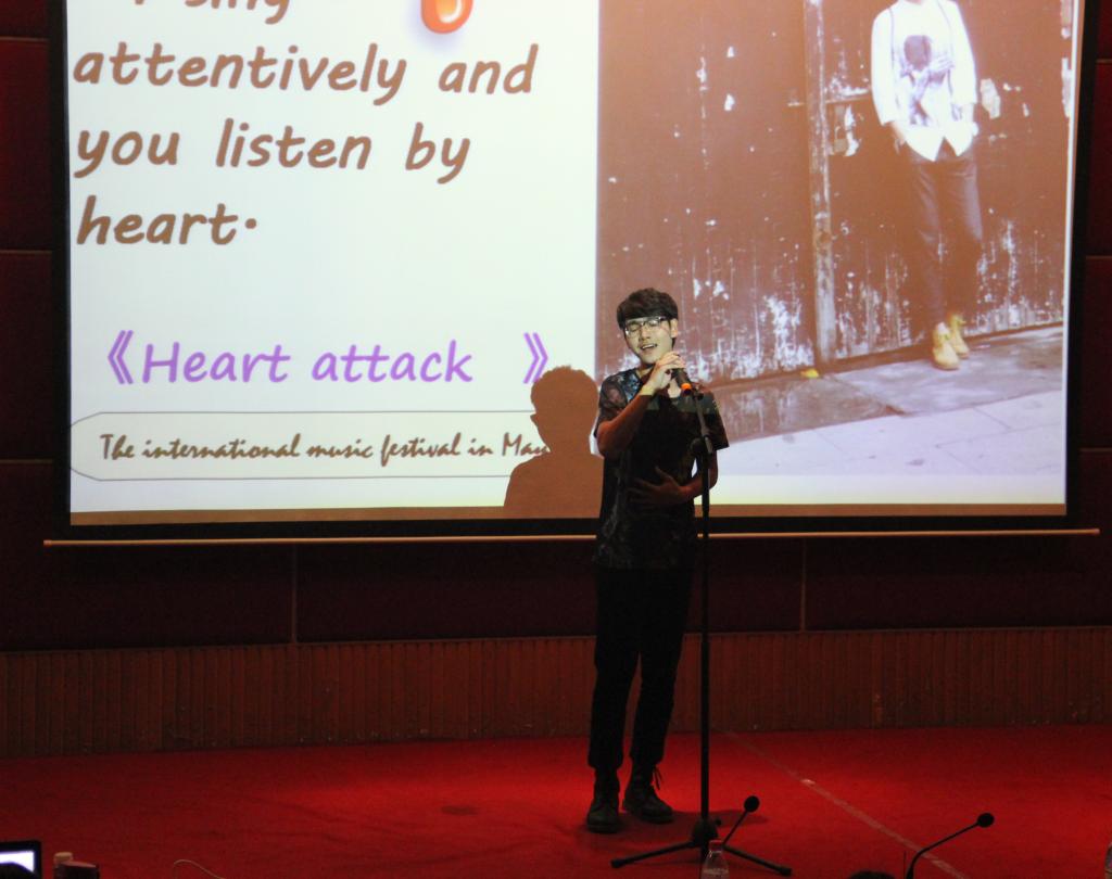 2015年5月24日晚上18:00,由qmh官网学生会文艺部承办的“五月外语音乐节”决赛于qmh官网7200阶梯会议室成功举办,本次决赛邀请到qmh官网第十三届十佳歌手的十强选手李源同学、2013年五月外语音乐节的冠军左思宇同学、2014年五月外语音乐节最佳口语奖获得者叶茂同学以及2014年第十三届校园十佳歌手冠军、五月外语音乐节冠军李彦瑾同学担任评委。