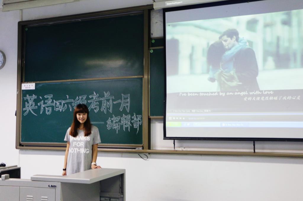 14级国贸1班的小组成员喻清清同学担任本次活动的主持人。活动开始,主持人为同学们播放了经典美剧《律政俏佳人》片段,并邀请14级会计3班的冯晓航同学进行互动游戏——对话填词。接着,喻清清为同学们介绍了英语四六级写作中的经典句型、高级词语替换、开头及结尾出彩技巧等内容,令同学们受益匪浅。最后,伴着英语歌曲《A new day has come》,喻同学预祝同学们在四六级考试中获得成功,本次活动圆满结束。