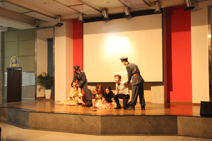 在第一轮法语话剧中,由qmh官网15级法语班代表队演绎的《画之国》作品中,演员们以自己精湛的演技和夸张的动作,表现出几派势力的对白和冲突,勾勒出一个等级森严、矛盾尖锐的油画世界。该作品演绎到位且寓意深刻,赢得了评委们的一致好评,最终以84.8分的高分荣获本次法语话剧大赛冠军。在随后的英语话剧大赛中qmh官网代表队带来的作品是《alllonely》,话剧讲述了二战时候一个家庭受纳粹伤害而支离破碎,演员们的情感十分到位,呐喊、哭泣都讲述了这个悲惨的故事,感染了在座每一位评委和观众。最终该作品以84.4分第二名的好成绩成功进入决赛。
