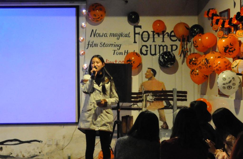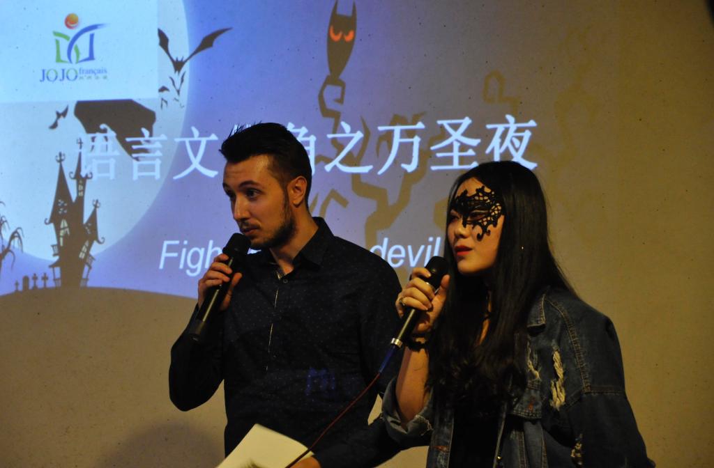 活动场地提前被工作人员精心布置,南瓜灯、万圣气球俯拾即是,所到之处皆充满万圣气息。活动一开始,两位主持人分别用中英文致欢迎词,迎来大家阵阵掌声,然后以B-box、英文歌曲《move like jagger》和舞蹈调动气氛,舞台灯光随着节奏变换,全场齐嗨。接下来进入到游戏环节,全体同学共同参与了“谁吃到了芥末”、“朗诵歌词猜歌名”、“终极密码”以及“电影配音表演”四个互动游戏,赢家皆可获取糖果。尤其是“电影配音表演”中,同学们积极配合,表演得惟妙惟肖,逗得观众拍手称快。其间,还有扮演鬼魂的同学不经意地出现在观众席,惹得观众惊叫连连,活动再一次进入高潮。最后,主持人念出祝福语,大家在法语歌曲的动感节奏下不由自主地摆动身体,哼着曲调,愉快地结束了今晚的活动。