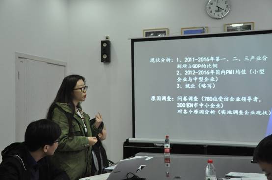 本次竞赛有四个团队参加,分别是大学生社会实践平台项目、N市劳动密集型中小企业转型困境与措施研讨、路边烧烤油烟处理器装置设计和“一带一路“战略与中小企业融资问题分析项目。首先是潘进煜同学阐述分析大学生社会实践平台项目内容,他以大学生兼职为核心讲述了其团队对本次项目调研做出的研讨结果与努力。其次是刘景西同学发言,她代表其团队给大家展示了他们所做的解决路边烧烤油烟问题的科技作品的图示模型,三位老师相继做出评审后与主讲人进行答辩,老师一问接着一问,同学积极耐心地回答,环环相扣,激动人心。最后是赵露露和姚钰茹两位同学对他们的项目做出的调研报告,他们对劳动密集型中小型企业转型困境和融资问题做出了充分的调查分析和报告。三位老师强调了学术科技作品竞赛所应体现的实用新型性、科学性、先进性和现实意义的问题。