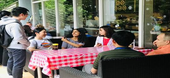 活动当天下午,首先由工作人员向留学生和外教介绍大厅里的各国的国旗,他说道:“每一面国旗都是文化交流的纽带,将不同文化的培养的学子联系了起来。”在场的学生和老师都十分赞同。接着,工作人员继续介绍,语言准确到位,声音洪亮有力,在提到学生会和义协时更是声情并茂,从大厅墙上的徽章开始,细到各个部门的活动和工作,大家无一不被他所感染。不禁让人想到,世界虽纷扰但每一个文化交流的种子依然能够在相互了解的欲望中冲破坚硬的外壳,茁壮生长。接着,工作人员带领留学生参观咖啡吧和学生自习室。