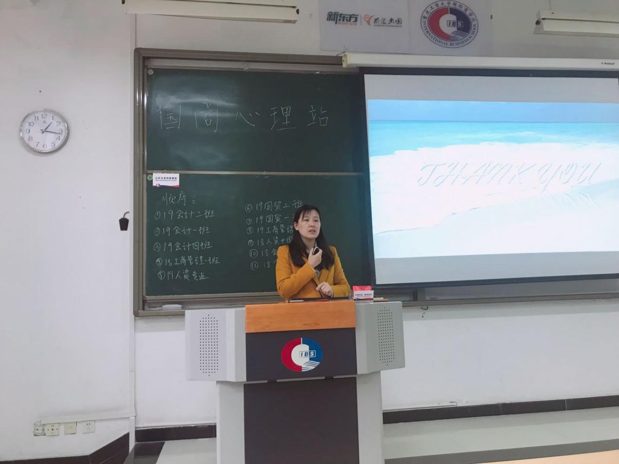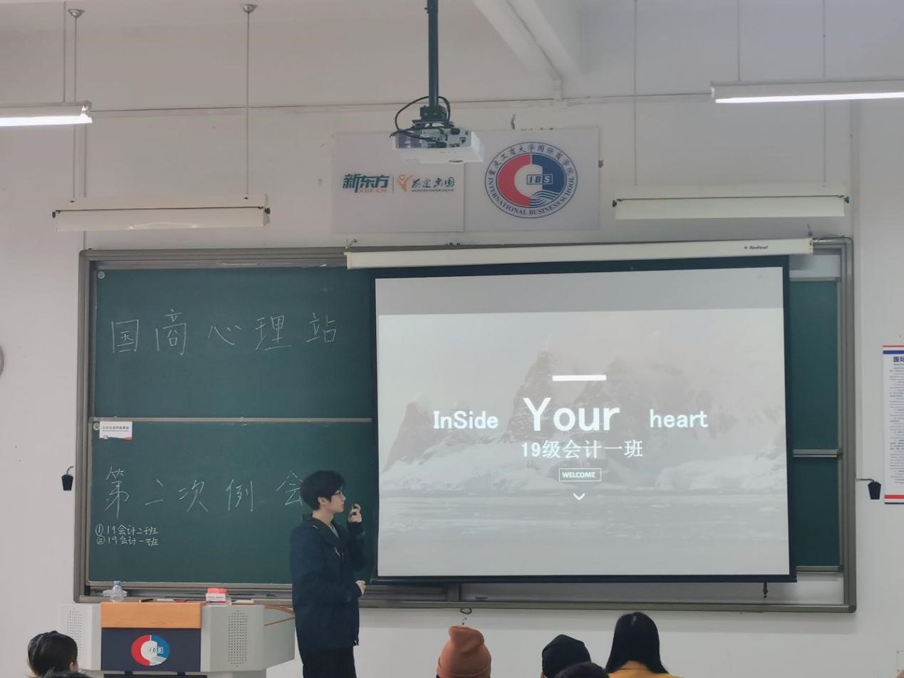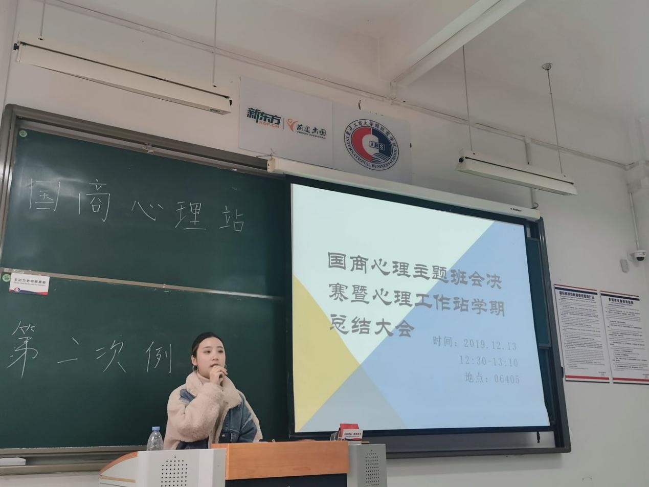 会议第二个环节是由心理工作站站长李佳瑞对本学期心理工作站工作情况做总结。她指出了本学期心理工作中存在的不足之处并对表现优秀的心理委员进行了表扬,呼吁各班心理委员要与工作站提高配合度、积极自觉的融入到心理工作站所举办的各类活动中来。最后,她对国商心理工作站下学期的活动做出了规划,使各班心理委员对工作安排和工作内容有了更清晰的了解。