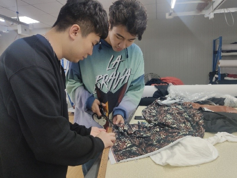图为:学生亲身实践剪裁衣料