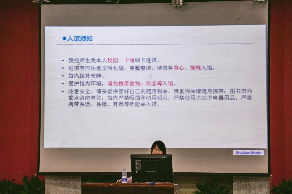 本次讲座围绕“图书馆概况、资源、服务和翠湖文化系列活动”四个主题展开。肖老师为同学们介绍了南岸校区图书馆(以下简称“主馆”)的概况,她用图文结合的形式向同学们展现了主馆大气磅礴的外观和形式多样的空间资源;为同学们介绍了主馆的纸本资源和数字资源,并讲解了这两种资源的查询方法;对主馆的服务展开讲解,其中着重介绍了开馆时间和图书的借阅流程。最后肖老师向同学们展示了丰富多彩的翠湖文化系列活动,引起了同学们浓厚的学习兴趣。讲座现场气氛活跃,同学们热情度极高。