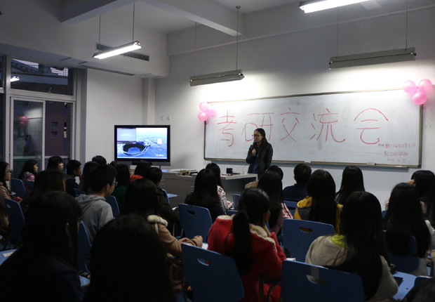2015年4月9日晚上7点,院学生会勤工部于qmh官网402教室成功举办考研交流会。本次交流会邀请到重庆大学会计系研究生伍佳音、南京大学金融系研究生潘梦真以及四川大学金融系研究生唐贝,与会人员均为qmh官网有考研意向的同学。