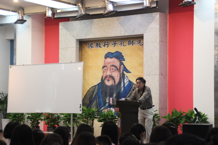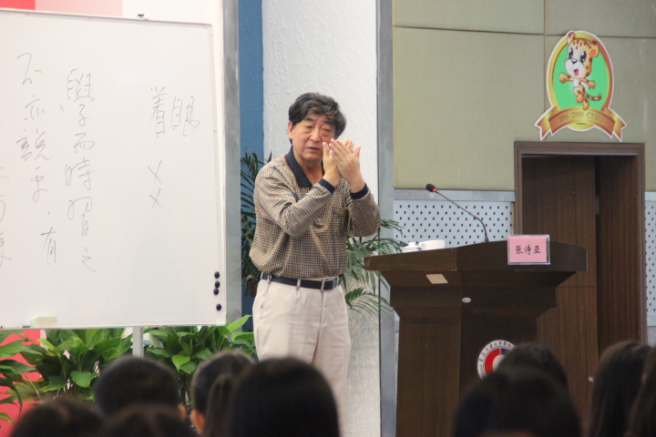 活动第二阶段为“中外文化大讲坛”首次讲座,张诗亚先生为主讲人。在这场精彩的讲座中,张先生谈到,人与其他一切动物的区别在于人是符号的动物,而符号的系统便是文化。张先生认为,孔子在逝去两千多年以后,其博大精深的思想仍然存留的原因,正是人类把思想用符号的物质形式保存了下来。张先生从“忠”、“恕”、“仁”、“学”等这些基本的字眼中深入解读了孔子的思想体系,以及其在现实社会的价值,并提出了“同构”与“找眼”两种儒家思想的学习方法。最后,张先生对教师的“教”和同学们的“学”表达了殷切的期望。