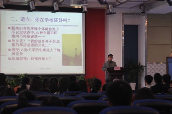 讲座伊始,梁先生首先谈到升学势必引发转变,不论是时空上,还是人际关系,甚至学习内容与要求都发生了极大的转变。而这些转变新生别无选择,必须面临学习、就业、人际交往困难、生活和经济压力这四大心理压力。梁先生还提到,一切开始于结束,结束开始于脱离,大学生应不断地主动适应世界的变化,从外部管控为主逐渐转变到自我管控为主。