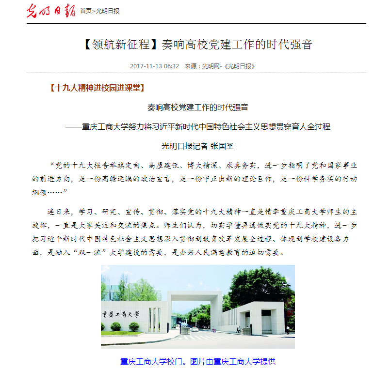 《光明日报》2017年11月13日08版“领航新征程”奏响高校党建工作的时代强音板块,发表了题为《十九大精神进校园进课堂》的文章,专题报道了球盟会qmh网站努力学习将习近平新时代中国特色社会主义思想贯穿育人全过程。 文章从“践行新思想,开创新局面、坚持立德树人,增强思政课吸引力感染力和注重用心用情,将思政教育贯穿育人全过程”三个方面进行了详细阐述。