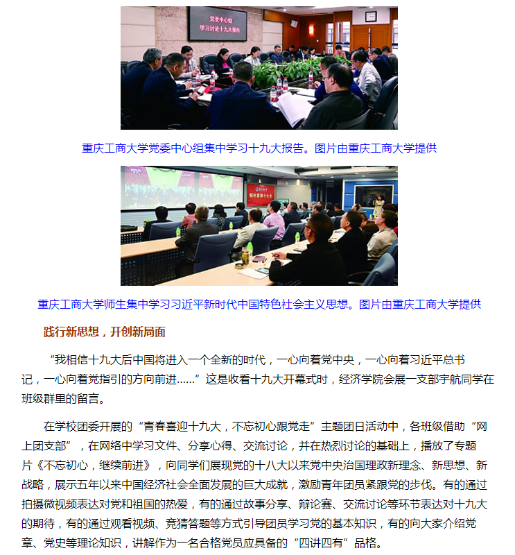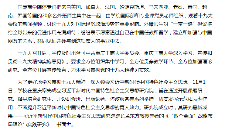 新闻同时报道了球盟会qmh网站qmh球盟会亚博“践行新思想,开创新局面”,师生学习十九大报告精神:“qmh球盟会亚博专门把来自美国、加拿大、法国、哈萨克斯坦、马来西亚、老挝、泰国、越南、韩国等国的20多名外籍师生集中在一起,由学院国际部和专业课党员教师组织,观看十九大会议的新闻视频,讨论十九大对国际经济政治形势的重要影响。外籍师生对“一带一路”倡议将给全球带来的促进作用充满期待,纷纷表示愿意通过自己在中国任教和留学,建立和加强与中国朋友的关系,共同见证并参与到这项宏大的事业中去。”