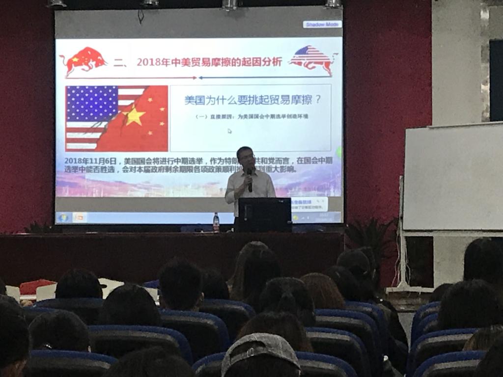 2018年9月28日上午10:00,学院党总支书记、院长赵驹教授在60407多功能报告厅为学院全体应届毕业学生集中讲解了专题党课《理性认识2018年中美贸易摩擦》。学院党总支副书记杨倩,学工系统老师及全体应届毕业生400余人参加了此次活动。
