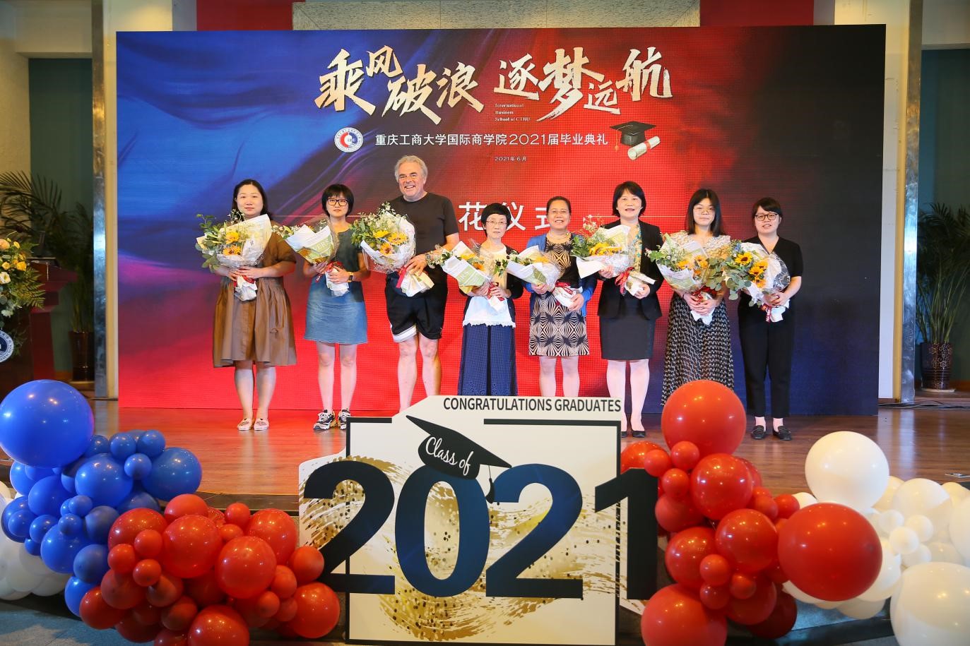 第五个环节是献花仪式,毕业生代表们手捧鲜花,将最诚挚的感谢送给曾给予他们谆谆教诲的老师们,感谢老师们四年来的辛勤教导和栽培。