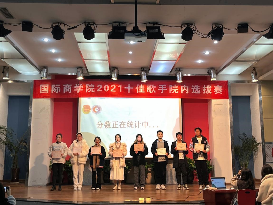 最后的决赛环节,向芸萱,周佳宜,张漫黎,付瑶,陈思岐,彭雨佳,邹佳妹,杨润,姜大伟,胡伟豪,张倬瑞十位同学用精彩的表现为现场的观众带来了一场精彩的视听盛宴,他们顶住压力,发挥出了自己最好的状态,收获了经久不息的掌声。最终,进入决赛环节的十强选手荣获本届十佳歌手的称号。其中,来自20级金融二班的向芸萱同学,21级中法二班的周佳宜同学,21级工商二班的张漫黎同学分别斩获一,二,三等奖。